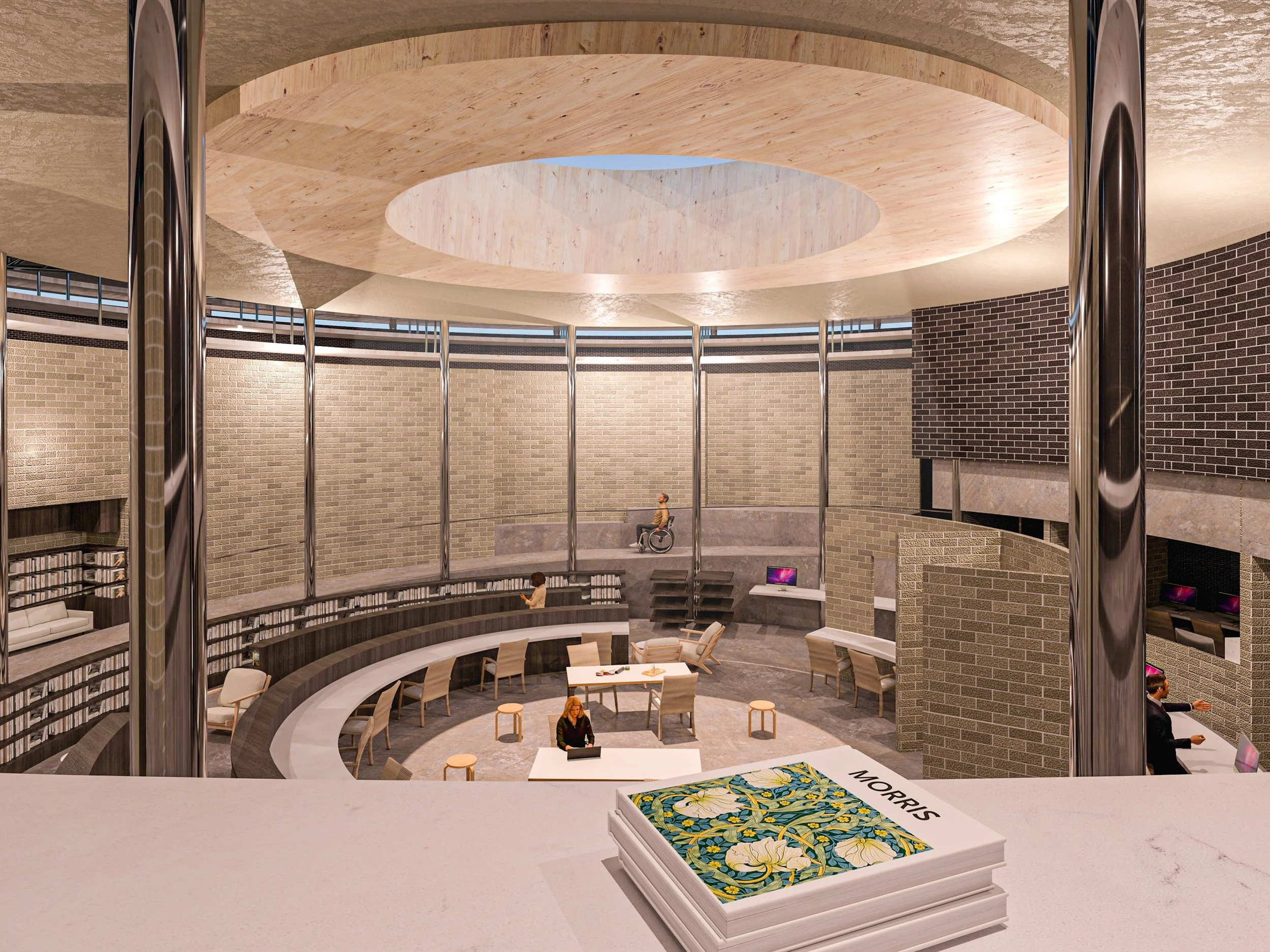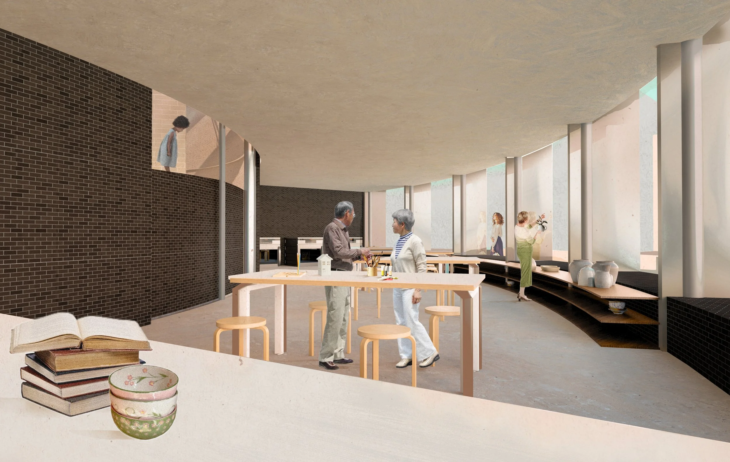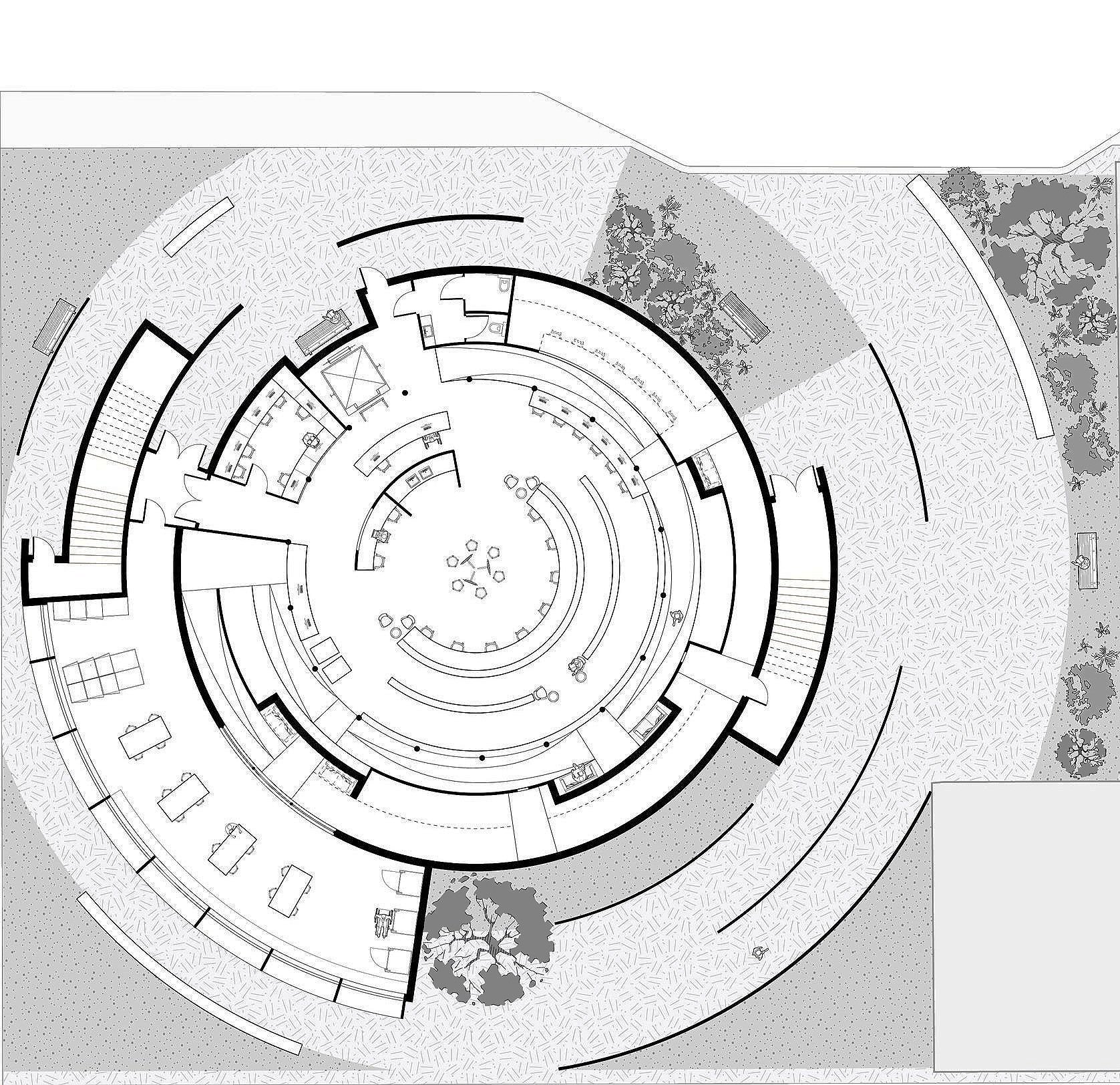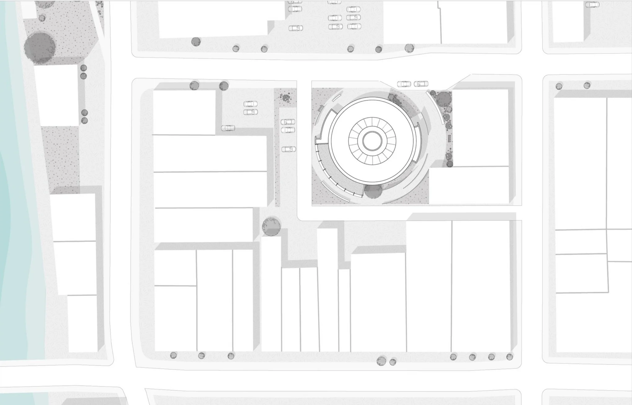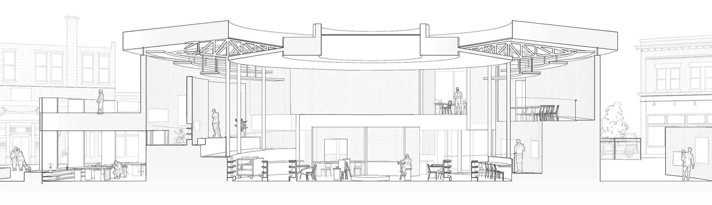 The Starry Night Library is located on a current parking lot site that feeds into The Galtway — two alleyways featuring large-scale art installations. Surrounding the library, a series of brick partitions of varied heights extend this existing gallery condition further onto the site, permeating the library to create an indoor gallery program within its primary circulation route. Appealing to local interests in visual arts such as the nearby Cambridge Centre for the Arts and the University of Waterloo School of Architecture, the library provides an environment where individuals can explore, study, discuss, and practice a range of creative visual mediums.